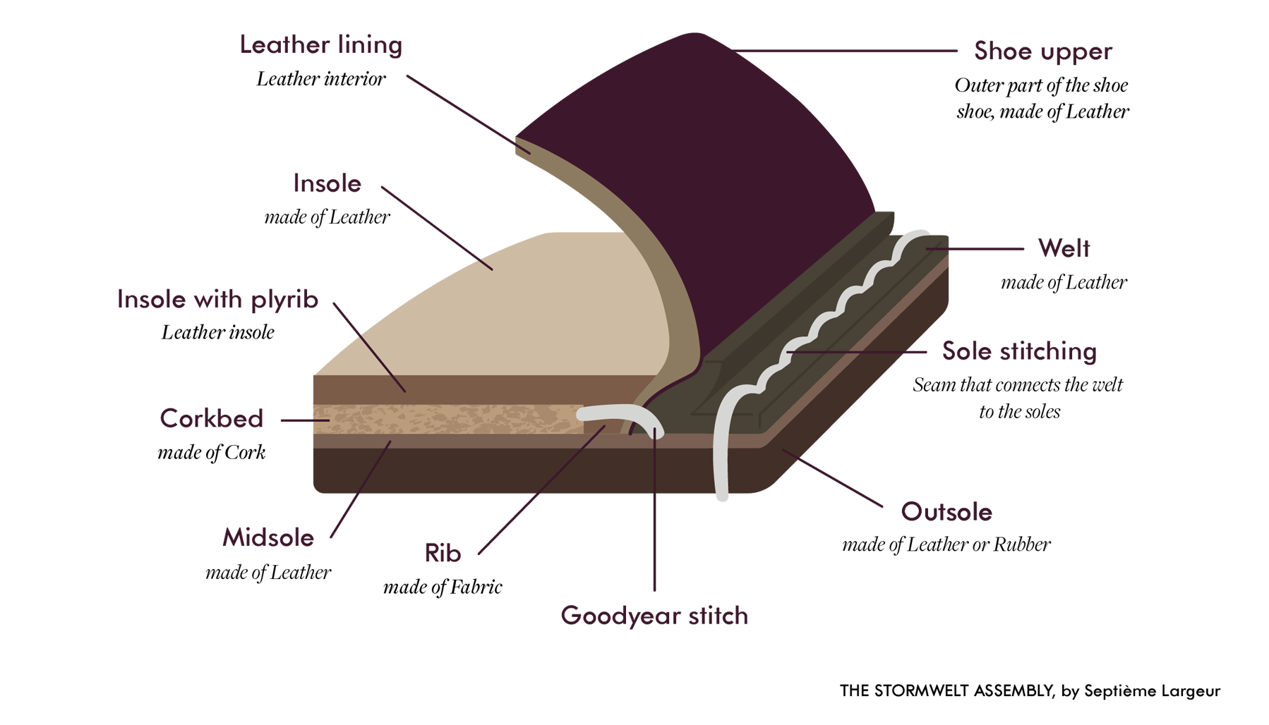 Its heel is called "baraquette", which means that the small stitch goes all the way around the shoe.