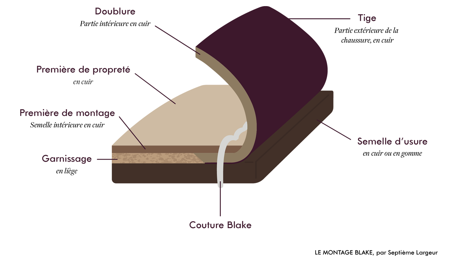 Construction simple, il consiste en une couture unique liant à la fois la première de montage, la semelle d’usure et la tige du soulier.