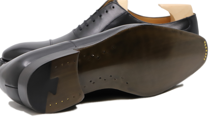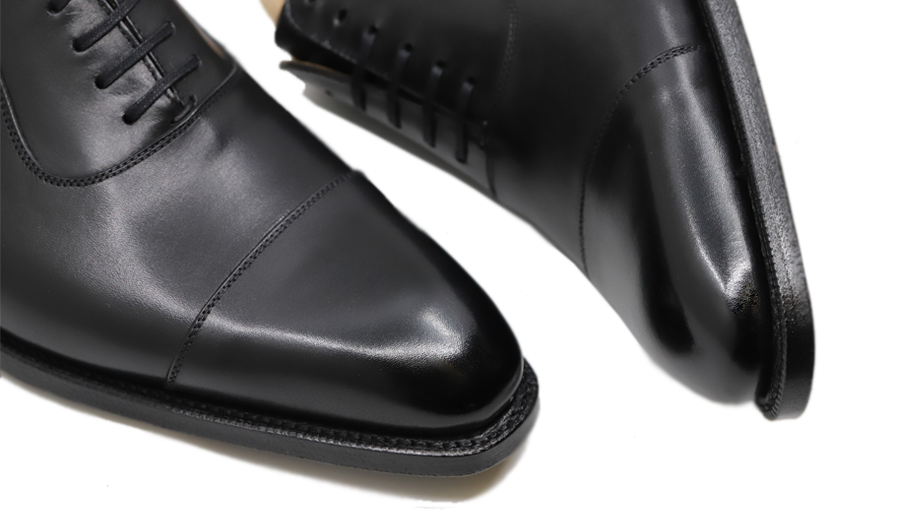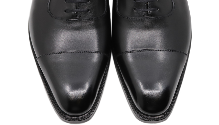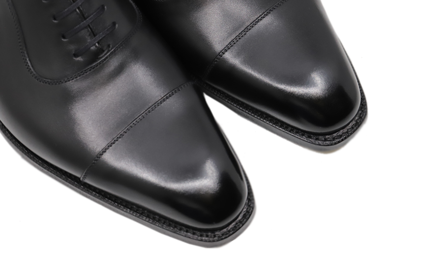 Le box calf noir utilisé est un cuir de veau pleine fleur, teinté dans la masse. Il présente l'avantage d'être résistant tout en restant habillé, avec notamment la possibilité d'y faire un glaçage.