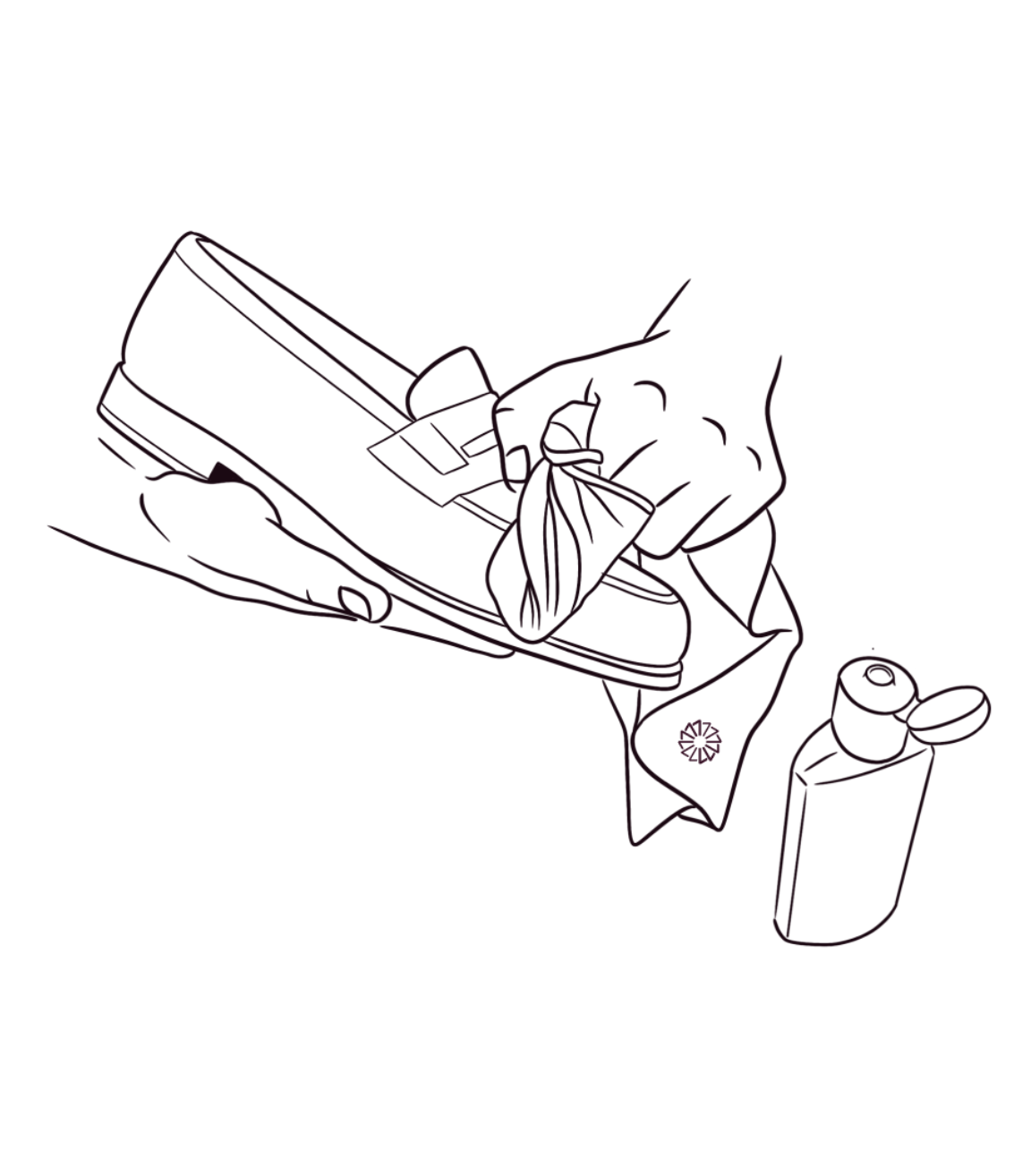 Cette étape, appelée « mise à nu », est, avec l’utilisation des embauchoirs, l’entretien le plus important. La lotion va agir à la fois comme un démaquillant et comme une crème hydratante sur le cuir, en le nettoyant des restes de cirage et en le nourrissant.