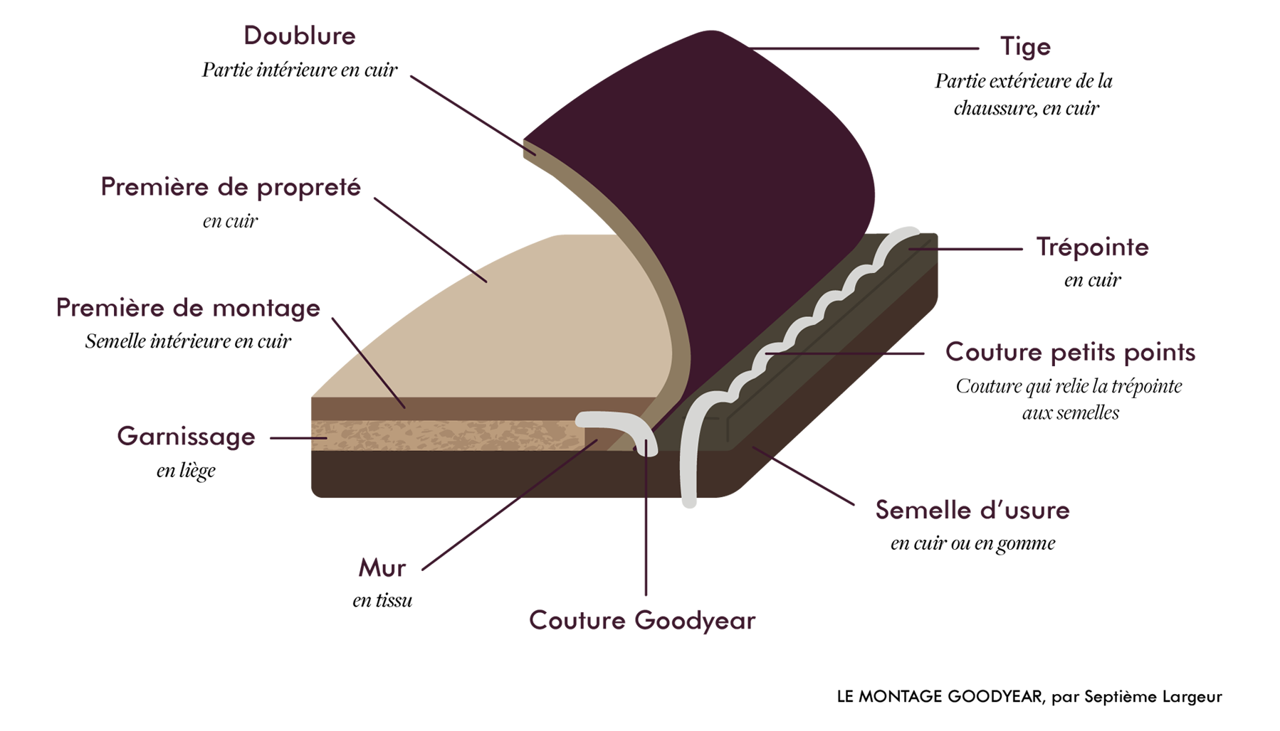 Ce cousu est constitué de deux coutures distinctes : 1. La couture Goodyear à l'intérieur, que vous ne pouvez pas voir ; 2. La couture petits points que vous pouvez apercevoir sur la photo ci-contre.