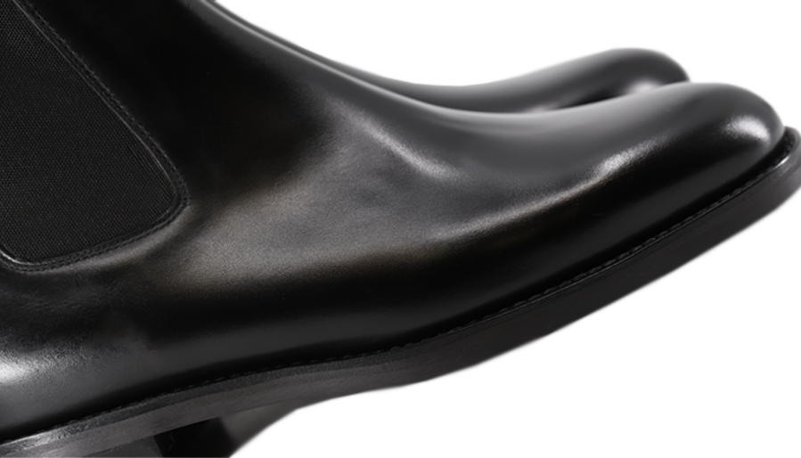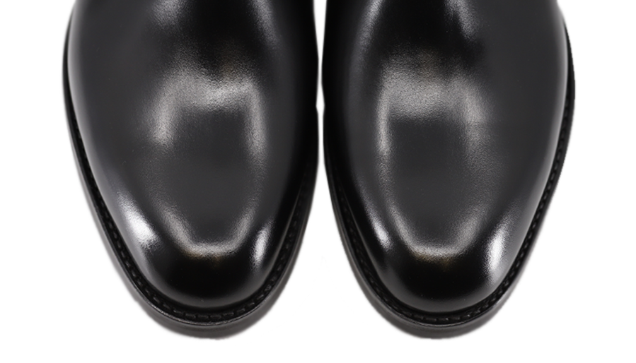 Le box calf noir utilisé est un cuir de veau pleine fleur, teinté dans la masse. Il présente l'avantage d'être résistant tout en restant habillé, avec notamment la possibilité d'y faire un glaçage.