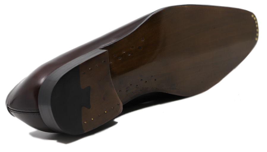 Démonstration du savoir-faire de la Maison, le travail de semelle en est aussi sa signature. Celle-ci est sous gravure fermée, protégeant ainsi la couture petit point de l’usure des premiers ports. Sous la voute plantaire se trouve un cambrion métallique mis en relief par un double chevillage bois, technique inspirée des bottiers et rare dans le prêt-à-chausser.